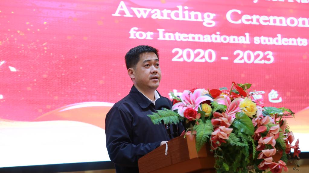 黄龙坚副校长代表学校党委向全体留学生表示亲切的问候,向荣获表彰的集体和个人表示热烈的祝贺。他表示新冠肺炎疫情期间,开云官网全体留学生在学校党委和国交中心的带领下临危不惧,同心协力,共克时艰,顺利度过了三年疫情难关。即使在艰难的情况下,留学生们仍然在各类比赛和活动中取得了佳绩,获奖的集体和个人是众多不懈奋斗的右医留学生的代表和榜样。同时,他还代表学校党委向今年初刚入学的一百多位国际新生表示热烈欢迎,感谢他们相信和选择了右医,并希望新同学们在右医能感受到家的温暖、温馨和关爱,有勇气和智慧去克服语言文化的差异和生活中的困难,在学业上不断取得进步和成长,创造更加美好的未来。