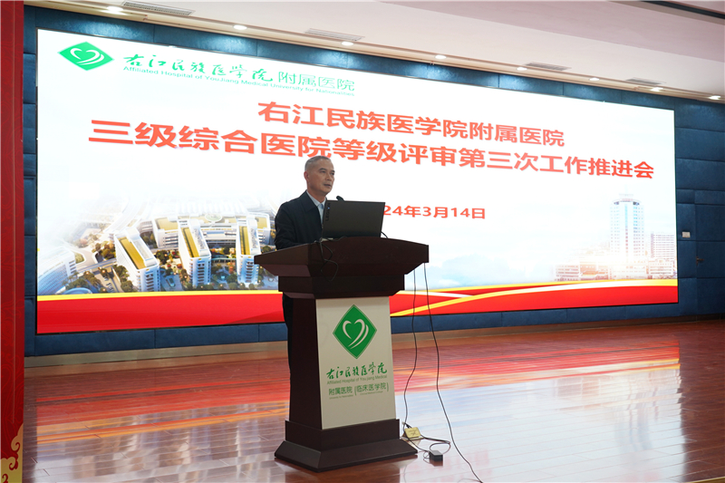 为进一步提升医院服务质量和管理水平,推动三级综合医院等级评审工作顺利开展,2024年3月14日晚,右医附院在总院区学术报告厅召开医院等级评审第三次工作推进会,右医附院党委林栩书记、韦忠恒院长、许靖副书记、陈文成副书记、邓益斌副院长、潘征副院长、梁楚晗纪委书记、蓝常贡副院长、覃灵艳总会计师和全院中层干部、总住院医师参加会议,右医附院许靖副书记主持会议。