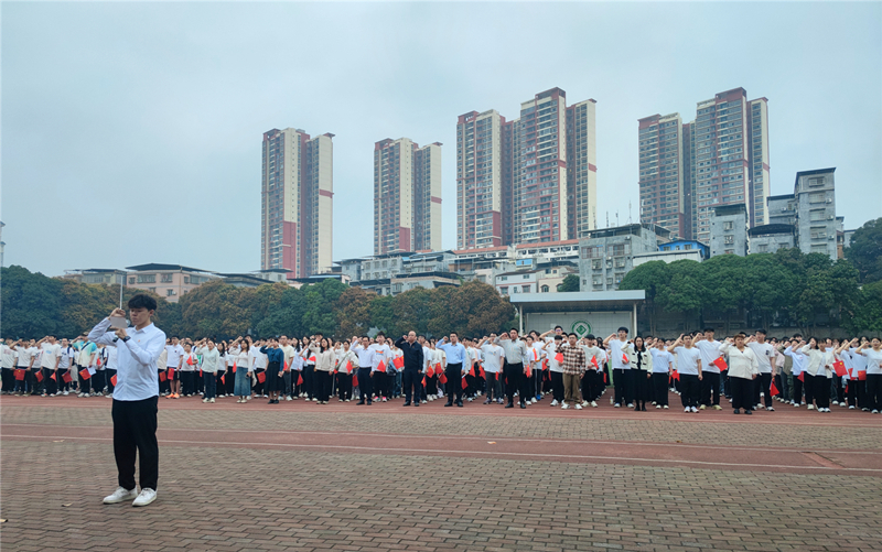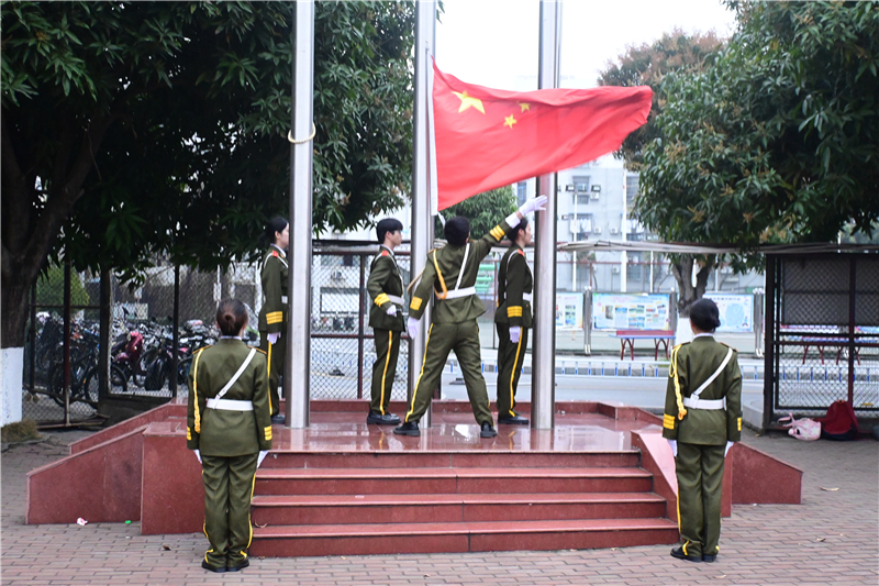 迎着朝阳,伴着晨曦,国旗护卫队昂首挺胸、步履铿锵地将鲜艳的五星红旗护送至升旗台前。伴随着激昂雄壮的国歌声,国旗冉冉升起。全体师生庄严肃立,齐唱国歌,行注目礼。