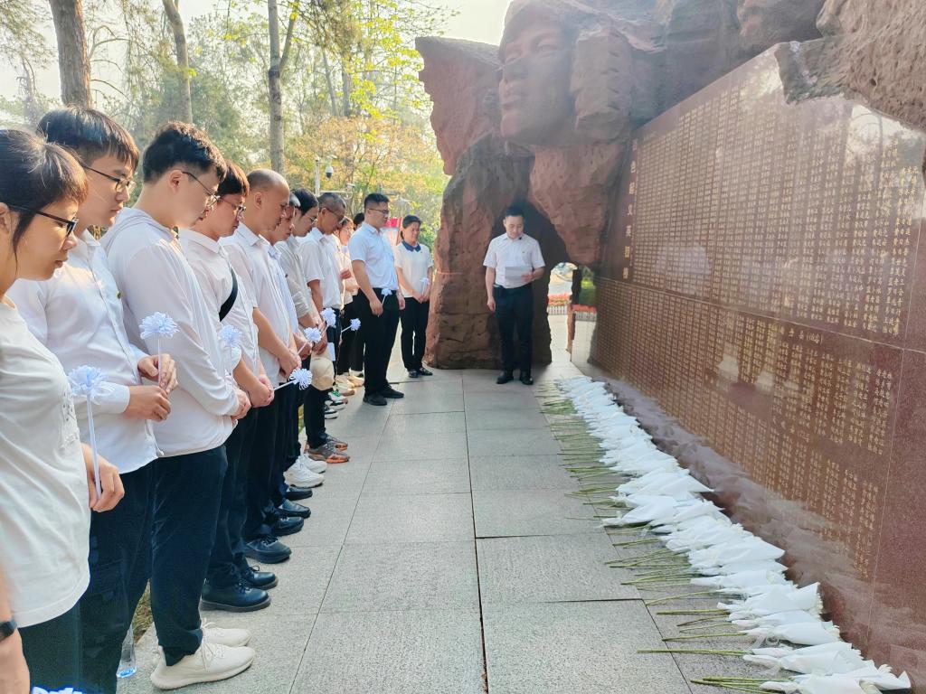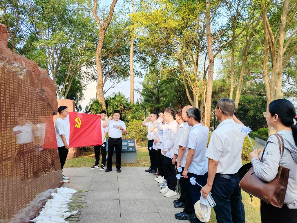 在百色起义英烈榜处,一位位革命烈士的名字映入眼帘,全体人员列队肃立默哀,鞠躬悼念,重温入党誓词,再一次立下了为党和人民的事业奋斗终生的铮铮誓言,并向英烈敬献亲手制作的小白花,祭奠革命先烈的不朽英灵。