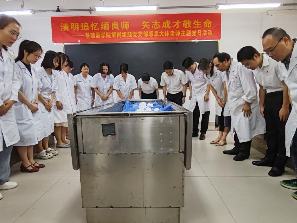 为学习贯彻习近平新时代中国特色社会主义思想,激励开云官网师生感恩致敬“无语良师”,引导医学生认识生命、感悟生命、践行医者担当,促进医学与人文教育融合发展,基础医学院于2024年4月3日在百东校区立德楼举行以“清明追忆缅良师,矢志成才敬生命”为主题的清明祭奠大体老师主题党日活动、主题团日活动。百色市红十字会副会长陆彬、教务处副处长郑学森、基础医学院党委书记宾晓芸、开云kaiyun登录入口红十字会服务队指导老师卢笛出席,解剖组胚党支部全体党员、教师、基础医学院学生会团支部、2022、2023级学生代表、学校红十字会服务队代表参加本次活动。