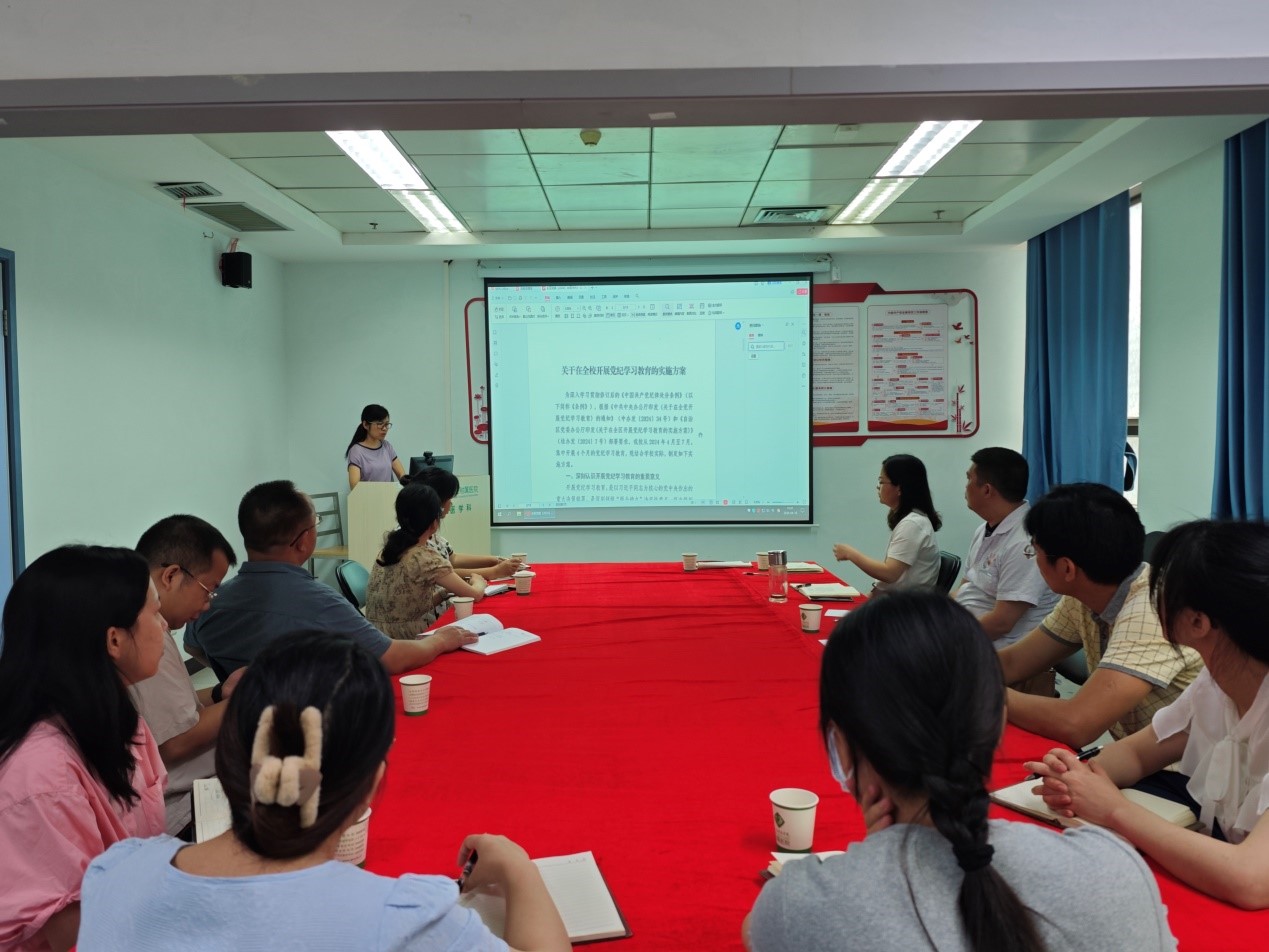 会上,李丹书记传达了学校党纪学习教育动员部署会上的精神,对学院开展好党纪学习教育进行部署,并提出要求,一是提高政治站位,深刻认识党纪学习教育的重要性。要以高度的政治自觉、精准的工作谋划、优良的学习作风、扎实的学习成效,高质量开展好党纪学习教育;二是要压实主体责任,精心组织实施。要准确把握目标要求,坚持规定动作做到位、自选动作有特色,不折不扣把各项工作落到实处;三是要立足实际,求真务实。要真正把党纪学习教育转化为党员、干部遵守纪律的政治自觉、思想自觉、行动自觉,要学纪知纪明纪守纪,使得党纪学习教育每项措施都成为促进中心工作的有效举措。