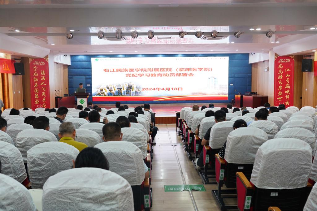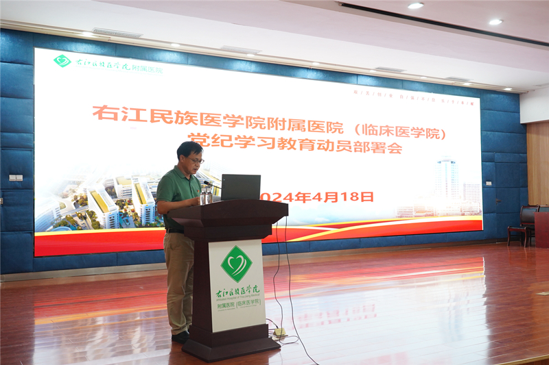 为推动《中国共产党纪律处分条例》(以下简称《条例》)在党员领导干部中走深走实和清廉医院建设,2024年4月18日下午,右医附院在总院区学术报告厅召开了党纪学习教育动员部署会,深入学习贯彻党中央关于在全党开展党纪学习教育的有关要求,并就医院开展党纪学习教育进行再动员再部署。右医附院党委书记林栩进行动员讲话、右医附院院领导、全院中层领导、各党支部书记等参加会议,右医附院院长韦忠恒主持会议。