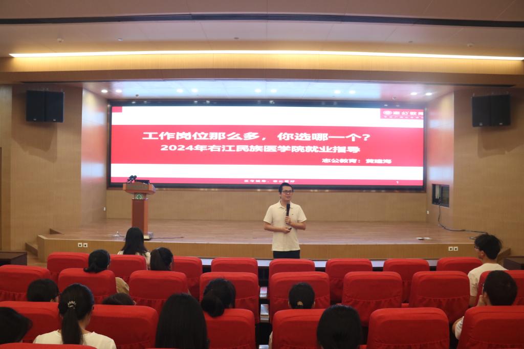 4月22日,公共卫生与管理学院在国际会议中心二楼报告厅举办就业能力提升专题讲座。广西考吧教育集团金牌讲师黄建海应邀为我院2025届毕业生和部分在校生作了专题讲座。