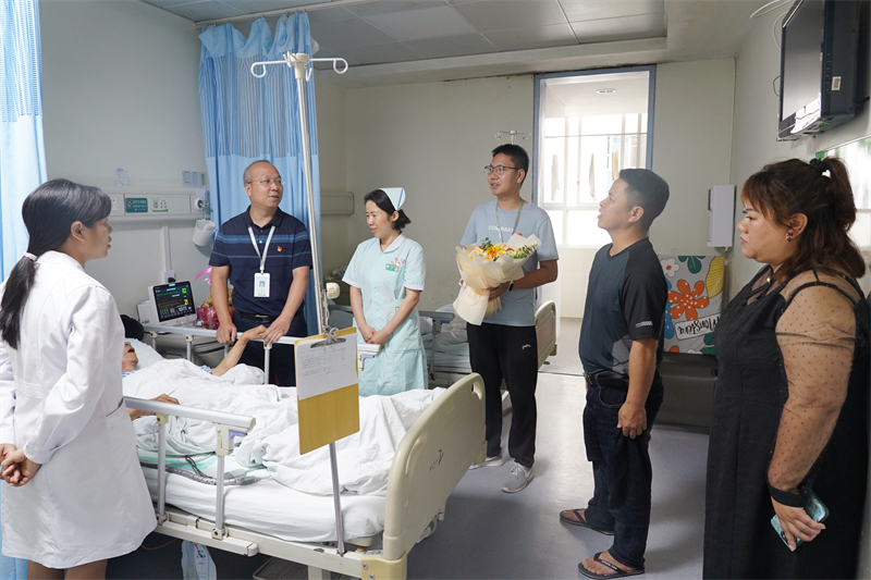 这一次,黄爷爷因“反复胸闷、呼吸困难4月余”入住右医附院总院区心血管内科二病区。在他住院期间,右医附院总院区心血管内科重症监护病房主任刘燕博士、肖鑫护士长带领医护团队针对老人高龄、多种慢性疾病的情况制定了详细的康复治疗方案,从日常关怀、陪伴聊天、一日三餐等细微环节入手,认真做好老人的诊疗和护理工作。经过十多天的精心治疗,老人精神状态明显改善。右医附院医护人员对于抗战老兵的爱心与关爱赢得了老兵及亲属的高度评价。2024年4月19日下午,右医附院党委陈文成副书记来到总院区心血管内科二病区看望黄爷爷,并代表医院向老人送去鲜花和慰问品,传递医院浓浓温情。在病房里,陈文成副书记与心血管内科医护人员、黄爷爷及其家属悉心交流,详细询问病情及治疗方案,深入了解黄爷爷的抗战经历,并表示崇高的敬意和亲切的慰问。