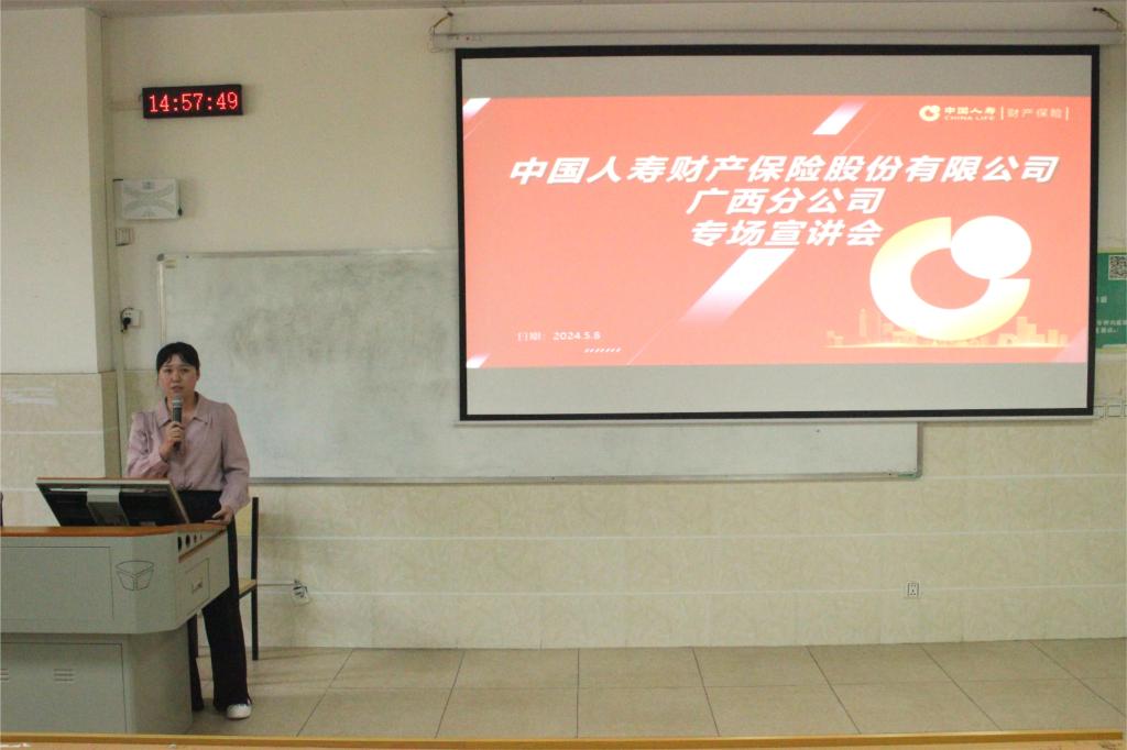 黄冰从企业基本情况、招聘岗位、岗位职责、福利待遇、职业生涯发展规划等方面进行了宣讲。她主要向同学们介绍了该公司人伤调查岗的基本情况。该岗位计划招聘19人,岗位分布在广西区内14个市。她鼓励同学们加入中国人寿财产保险股份有限公司广西分公司的大家庭,并与在场的同学进行了互动。