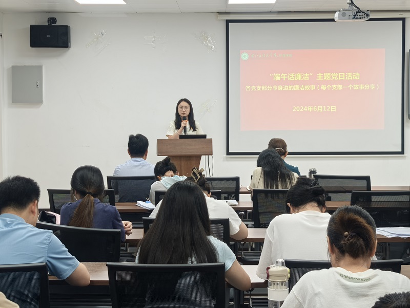 在“端午话廉洁”主题党日活动中,学生第一党支部莫宇婷分享“走廊医生”兰越峰的故事,学生第二党支部蓝敏溧分享张桂梅的故事,学生第三党支部林小雀分享廉洁奉公——孔繁森的坚守与奉献,学生第四党支部姚瑶分享医院清正廉洁故事——“心安”,学生第五党支部胡怡兵分享广西基层公务员的廉洁故事。通过分享身边的廉洁故事,引导学生树牢以清为美、以廉为荣的廉洁价值观,推动以廉修德、以廉促教、以廉进学入脑入心入行。