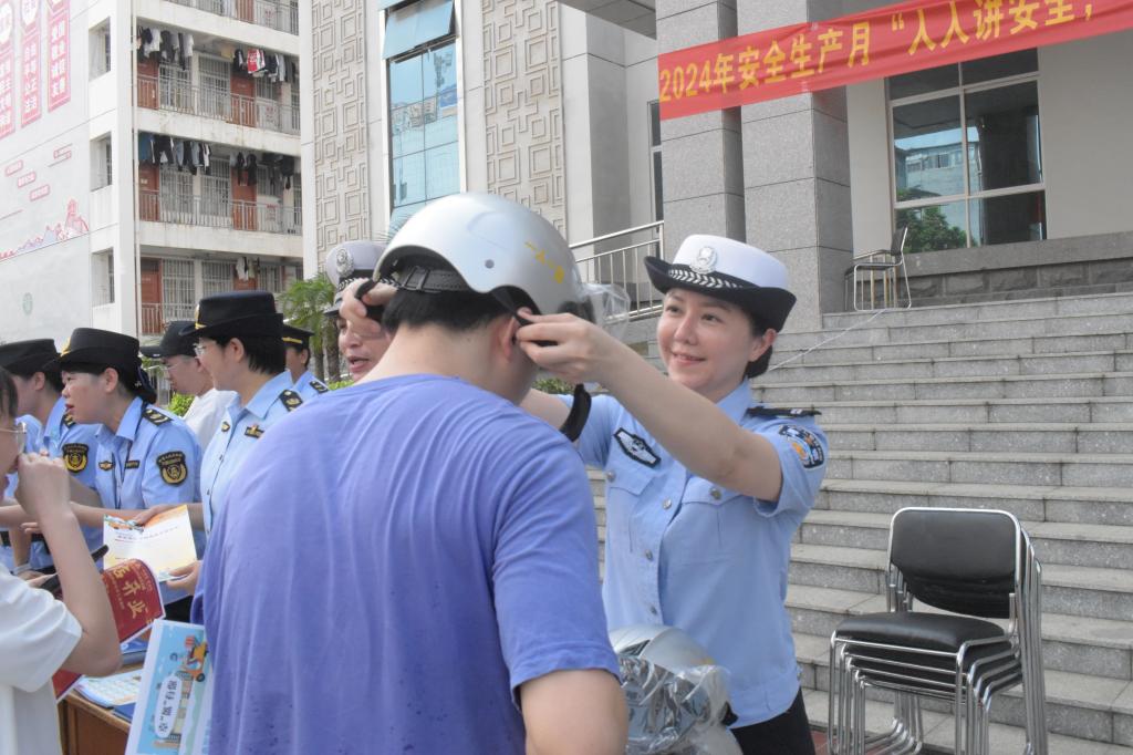 交警支队工作人员为同学们讲解如何安全佩戴头盔。