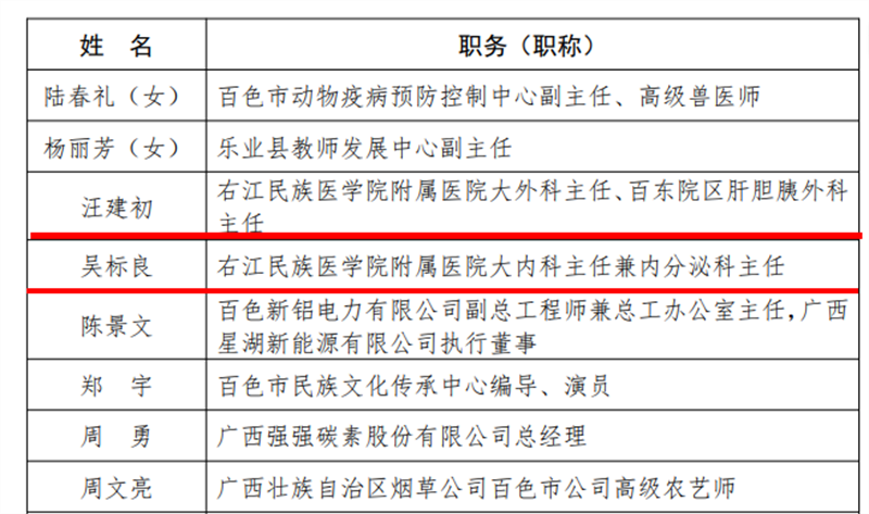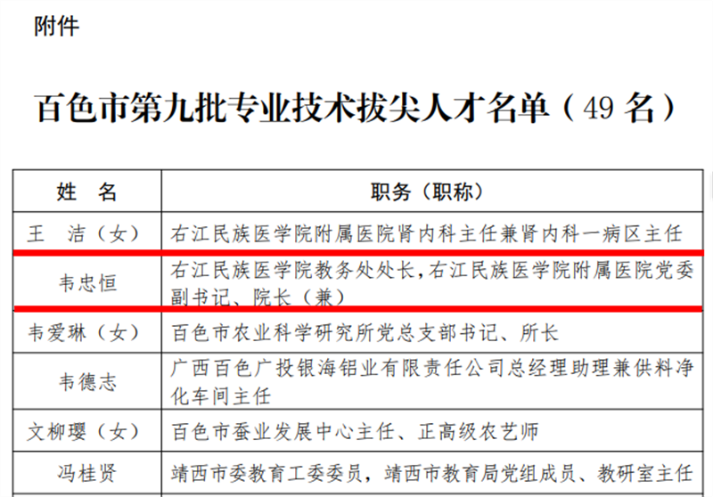 2024年6月12日,中共百色市委员会、百色市人民政府下发了《关于命名百色市第九批专业技术拔尖人才的决定》百委〔2024〕216 号文件,右医附院院长韦忠恒教授、肾内科主任兼肾内科一病区主任王洁教授、大外科主任兼百东院区肝胆胰外科主任汪建初教授、大内科主任兼内分泌科主任吴标良教授等四人,被评为百色市第九批专业技术拔尖人才。