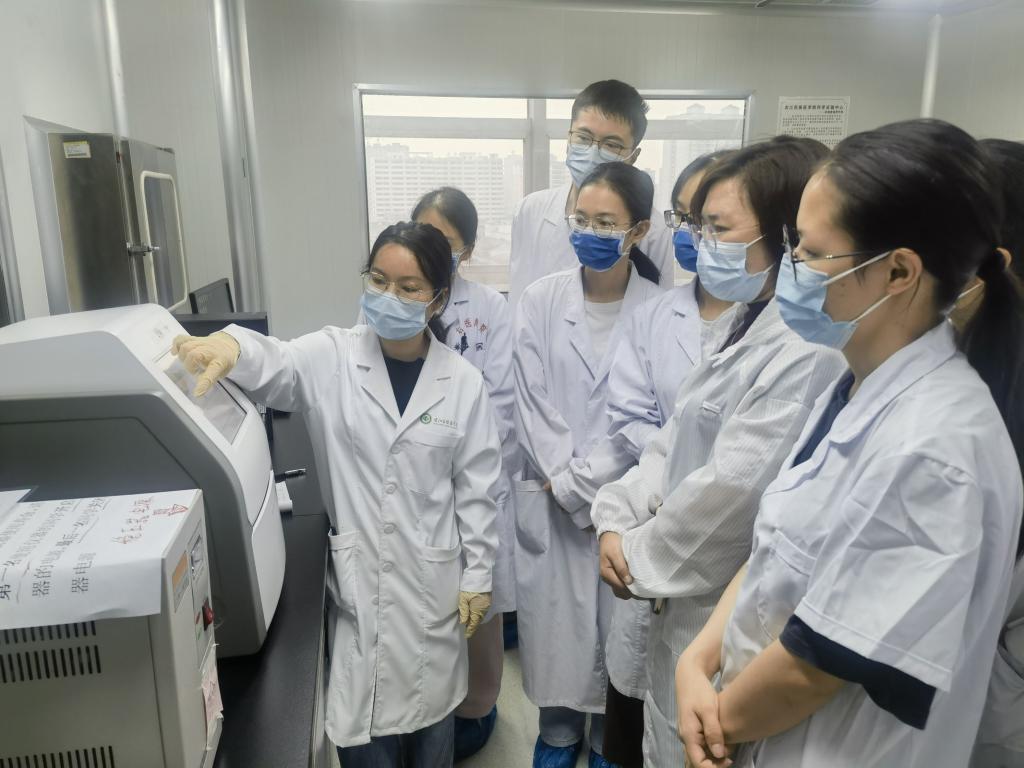 苏莉莉刘筝杨睿睿和王静4老师在69-14 PCR实验室分批次示范罗氏96实时荧光定量PCR仪和天隆全自动医用PCR分析系统的操作规程并讲解仪器使用注意事项,并对现场师生进行操作指导和答疑;刘筝老师强调在实验操作过程中要树立安全防护意识,严格按照操作规程上机并做好实验废物处置,确保实验室生物安全;杨睿睿老师着重强调此次荧光定量PCR上机实操考核的条件,要求同学们认真研学雨课堂公众号发布的课程学习资料,并按要求完成线上测试题