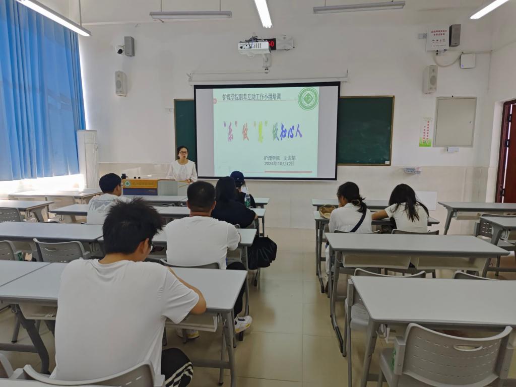 为了进一步强化大学生心理健康互助意识,提高朋辈心理互助能力,促进大学新生具备良好的心理素质,10月12日护理学院在百东校区守正楼C-102教室举办了“乐”做“慧”做知心人为主题的朋辈互助工作小组培训活动。活动由护理学院学生科文志娟老师主讲,2024级各班心理委员参训。