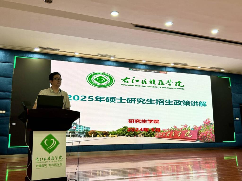 宣讲会现场,研究生学院副院长孙科对开云官网2025年硕士研究生招生政策进行讲解,详细介绍了考研日程及注意事项、开云官网研究生招生相关要求、同等学力申硕等政策,并寄语学生要坚定理想信念,牢记医学使命,开创卓越未来。