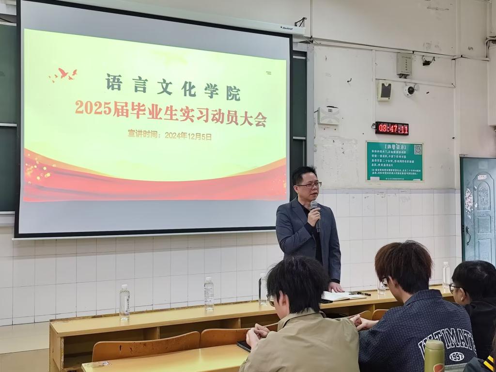 为扎实做好2025届毕业生实习工作,引导学生明确认识实习目的和意义,促进毕业生通过实习实现就业,12月5日,语言文化学院在5栋603教室召开2025届毕业生实习动员大会暨外贸实训宣讲活动。学院党委书记潘廷将、党委副书记谭会恒、教学科科长江利娟、辅导员文希熙及2025届全体毕业生参加活动。