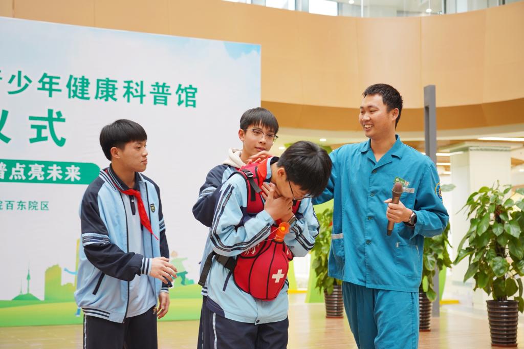 启动仪式结束后,与会领导、嘉宾及学生代表、患者和家属代表等共同参观了右医附院青少年健康科普馆,通过人体各系统器官模型、仿真模拟训练练习模型,以及VR游戏互动装置,沉浸式地学习健康科普知识。此外,健康科普小组医护人员还现场指导学生如何进行急救,如心肺复苏、海姆立克法、使用AED等,让学生对健康知识和急救知识等有了更深刻的认识。
