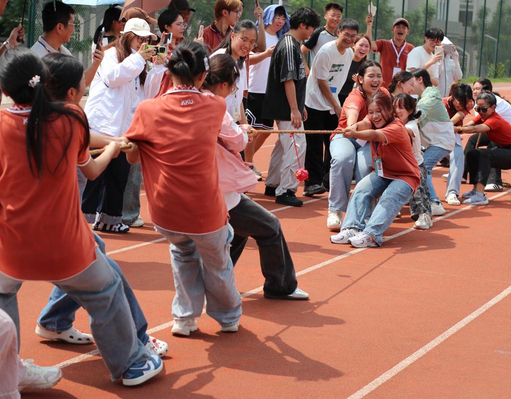 活动伊始,各项传统项目同步展开,现场气氛热烈。滚铁环赛场上,选手们全神贯注,铁环在精准操控下飞速滚动,计时比拼中尽显速度与激情;竹竿舞区域,中泰学子默契携手,伴随着清脆的竹竿敲击声,在开合间灵巧穿梭、跳跃,欢快的节奏传递着独特的民俗魅力;一旁的背篓绣球和投壶项目同样热闹非凡,参与者们相互配合、不断尝试,在轻松愉快的传统游戏中悄然拉近了彼此距离。随后,压轴的拔河比赛更是将现场氛围推向高潮——中泰学子先以混编组队,齐心协力紧握绳索奋力拼搏;继而以国籍分组展开较量,赛场呐喊助威声此起彼伏,生动彰显了团结协作的力量。活动最终在全体人员的温馨合影中落下帷幕,为这段充满欢乐的时光定格下珍贵瞬间。