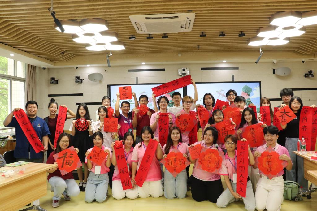 在文化体验环节,泰国师生积极参与了中国书法和非遗剪纸活动。书法体验中,他们拿起毛笔,尝试书写春联和“福”字,一笔一划间感受着中国书法的独特魅力;剪纸活动环节,在中泰师生的合作与我院师生的指导下,泰国师生手持剪刀,完成了一幅幅基础剪纸作品,亲身体验了中国非遗文化。
