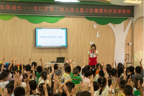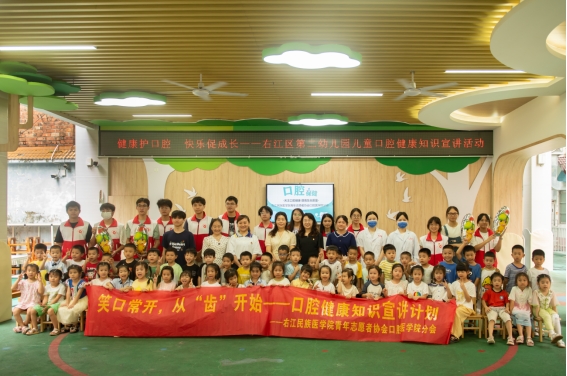 为深入落实国家《健康口腔行动方案(2019-2025年)》,充分发挥基层党组织在健康中国建设中的引领作用,6月13日上午,口腔医学院师生党员、团员联合开云kaiyun登录入口附属医院口腔科医务人员、青年志愿者协会口腔医学院分会成员组成宣教团队,走进百色市右江区第二幼儿园,成功开展了主题为“党旗领航明方向,护齿童行筑健康”的口腔健康知识宣讲与义诊活动。