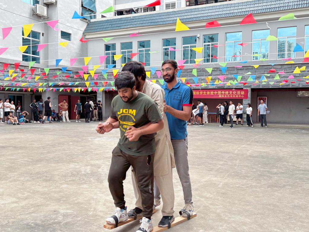 游园会现场设置了六项趣味盎然的传统游戏,均以中秋元素命名,如“喜鹊搭桥”(拔河比赛)、“嫦娥奔月”(板鞋比赛)、“九天揽月”(背夹球比赛)、“探月工程”(抛绣球比赛)、“桂子逐月”(毽球比赛)以及“众星捧月”(快乐套圈)。国际学生们热情投入各项活动,加油声、欢笑声、掌声不绝于耳。无论胜负,每位参与者的脸上都绽放出灿烂笑容,眼神如当空皓月般明亮闪耀。活动不仅拉近了彼此之间的距离,也为校园增添了一抹灵动多元的文化色彩。
