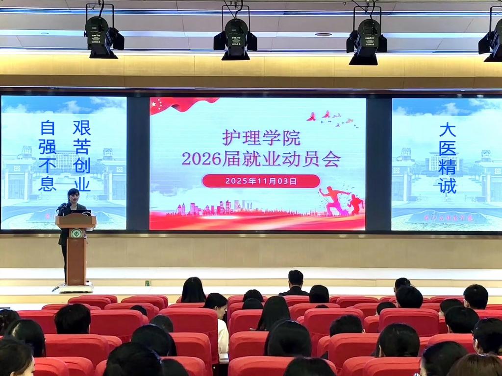 为积极应对当前复杂严峻的就业环境,拓宽毕业生职业发展视野,引导其精准锁定高潜力就业岗位,11月3日,护理学院分批次于国际会议中心二楼学术报告厅召开2026届毕业生就业动员大会。出席本次会议的有护理学院党委书记黄上峰、副书记邱勇强、副院长麻新灵,护理学院2026届毕业生参加会议。