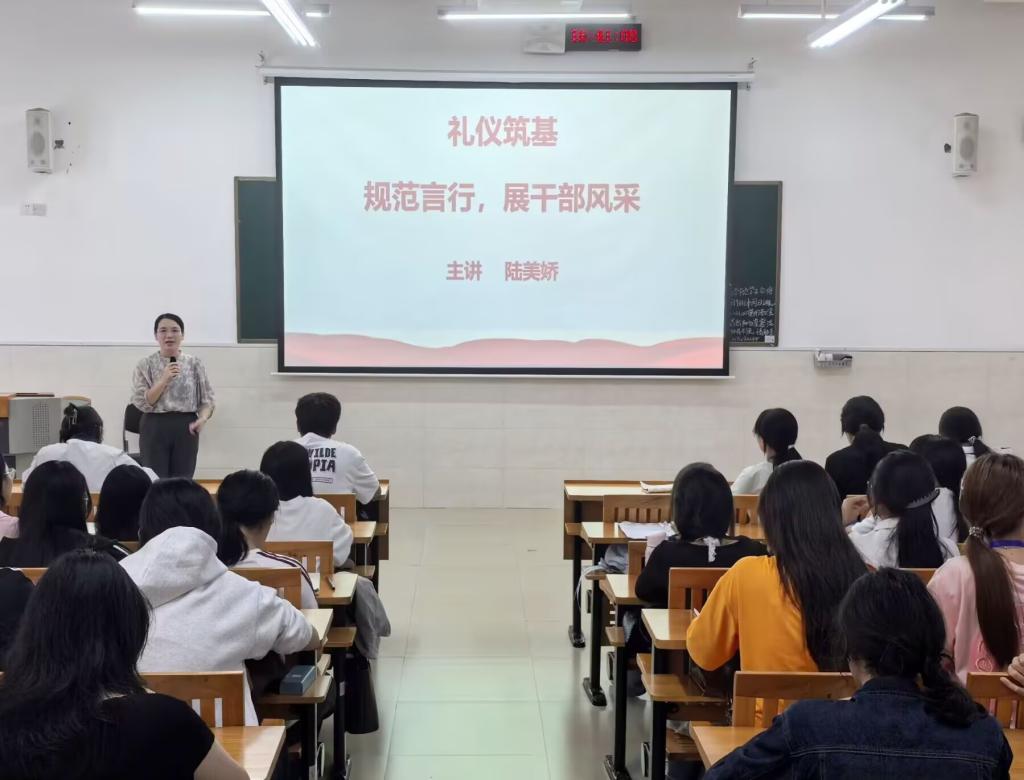 整场专题分享会紧密结合团员学习工作实际,分为学生干部礼仪素质培养和了解英雄人物事迹两大主题。聚焦礼仪培养,陆美娇以其深厚的专业素养,深入解读了塑造个人形象的核心要义与日常工作礼仪的实践规范。她强调,礼仪是学生干部展现风采的“第一张名片”。随后,陆美娇结合经典案例,对日常问候、称呼规范、短信沟通及会议报告等场景的礼仪细节进行了系统讲解,并分享了诸多塑造专业形象的经验技巧。此次培训有效助力了同学们将理论认知转化为实践能力,切实提升形象管理能力与职场礼仪素养。在“了解英雄事迹”板块,团员青年们认真观看了央视纪录片《青春中国》。影片通过展现不同时期青年英雄的感人事迹,深刻诠释了其背后蕴含的爱国情怀、奉献精神与责任担当。深入学习后,青年团员们深受触动,不仅加深了对英雄精神的理解,还激发了对赓续红色血脉、勇担时代使命的自觉性,为今后的成长与奋斗注入了强大的精神动力。