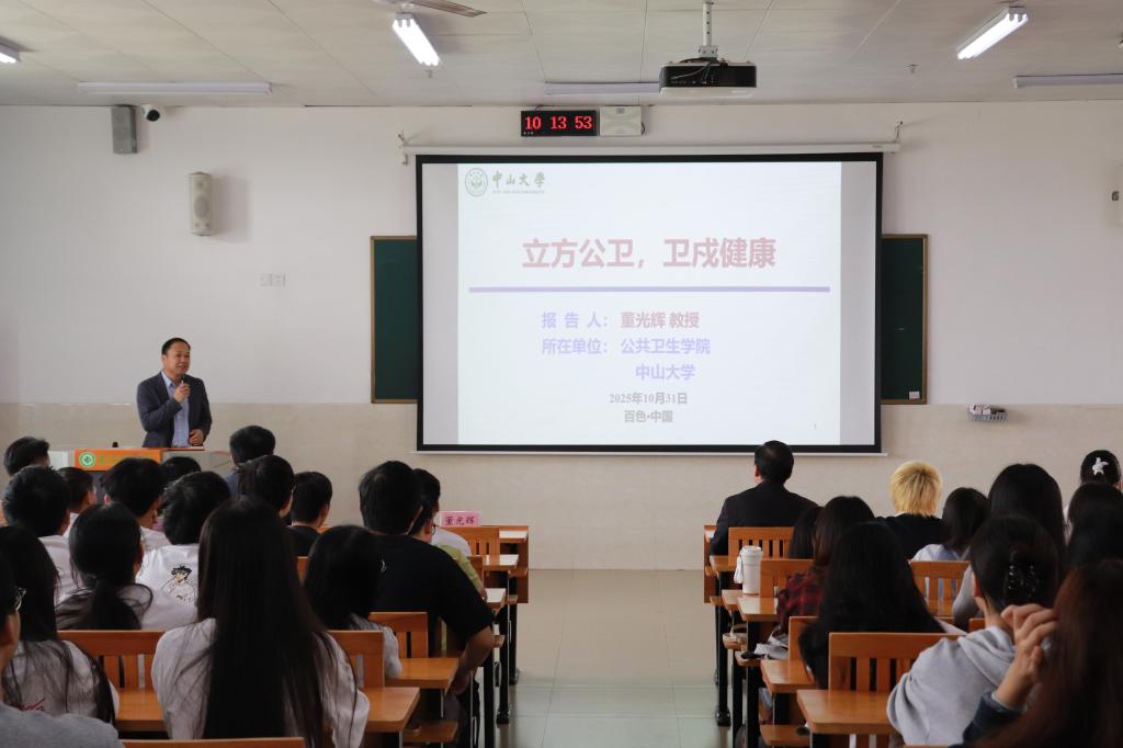 10月31日上午,中山大学公共卫生学院副院长董光辉教授应邀到开云官网,于百东校区守正楼A105教室开展《立方公卫,卫戍健康:预防医学的科研使命与时代担当》专题学术讲座。校党委常委、副校长谭盛葵出席讲座,公共卫生学院党委副书记、纪委书记卢小新主持,学院全体教师及24级预防医学专业学生参会。