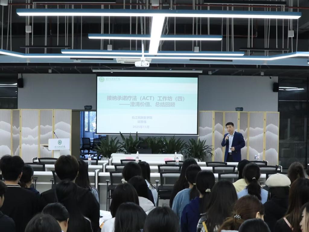 在东盟创新创业中心,护理学院党委副书记、教授、国家二级心理咨询师邱勇强以《接纳承诺方法(ACT)工作坊(四)——澄清价值 、总结回顾》为题,为大家讲解了接纳承诺方法(ACT)的基本原理与压力管理技巧,通过专业的内容设计与丰富的互动形式,为活动增添了人文关怀的温暖底色。