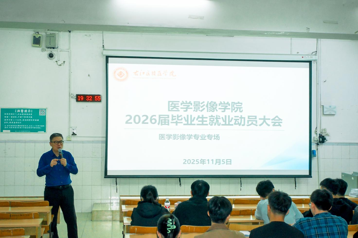 为扎实推进2026届毕业生就业工作,引导学生树立正确就业观、择业观,促进毕业生高质量充分就业,11月5日晚,医学影像学院在百城校区5栋301及506教室分专业召2026届毕业生就业动员大会。大会设医学影像学、医学影像技术两个专场,全体毕业生参会。