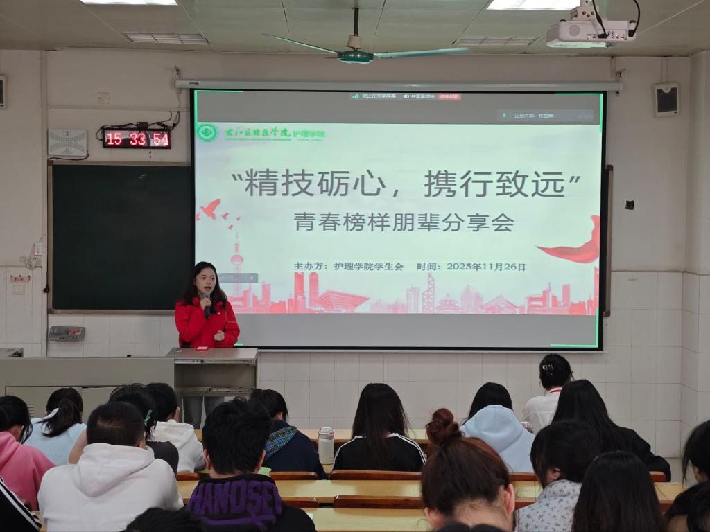 为强化学生专业技能与职业素养,搭建朋辈经验交流平台,激发“以赛促学、以练促行”的学习热情,护理学院于11月26日在百城校区6-302教室及腾讯会议通过线上线下同步进行的模式开展“精技砺心,携行致远”青春榜样朋辈分享会。本次活动采邀请到7位2022级在护理技能大赛中优秀的学长学姐担任主讲嘉宾。
