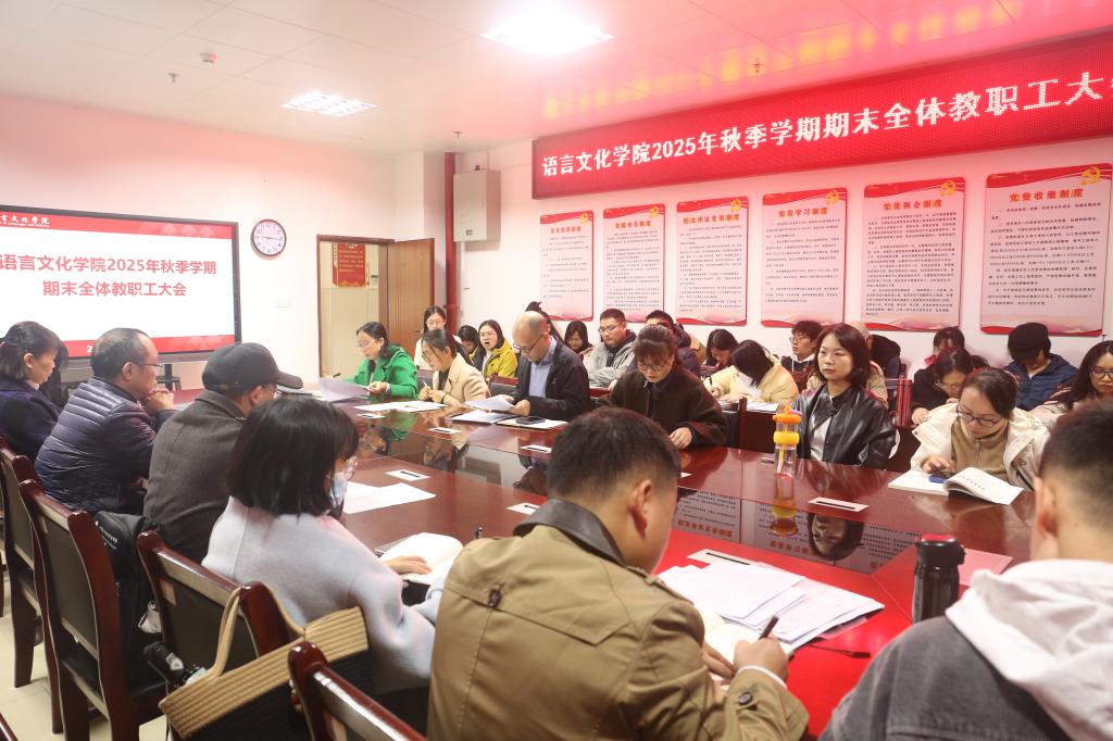 1月16日上午,语言文化学院在党员活动室召开2025年工作总结暨2026年度重点工作布置会,梳理总结2025年工作成效、存在问题及原因分析,科学部署了2026年重点工作任务。会议聚焦绩效激励、科学研究、教育教学改革、人才培养等核心工作,动员全院教职工统一思想、明确方向,以昂扬姿态迎接新挑战,推动学院事业发展再上新台阶。学院全体教职工参加了会议,会议由学院党委副书记谭会恒主持。