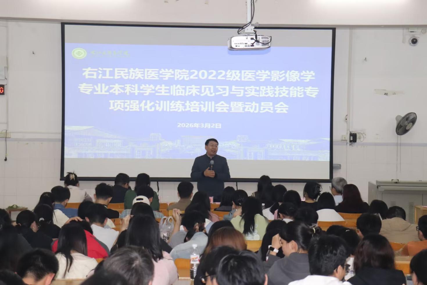 3月2日晚,医学影像学院在百城校区召开2022级医学影像学专业本科学生临床见习与实践技能专项强化训练培训会暨动员会。学校党委常委、副校长王俊利出席动员会,党委学生工作部、教务处相关负责人,医学影像学院全体领导、辅导员,2022级影本班班主任及全体同学参加会议。