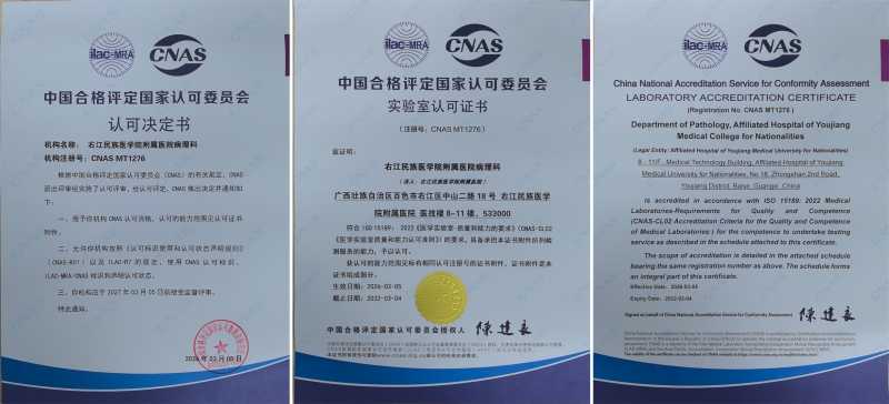 近日,临床医学院(附属医院)病理科正式收到中国合格评定国家认可委员会(CNAS)颁发的认可证书(广西首家)。这标志着科室质量管理体系、技术能力与诊断水平全面达到国际标准,成功跻身规范化、标准化的国际化医学实验室行列。