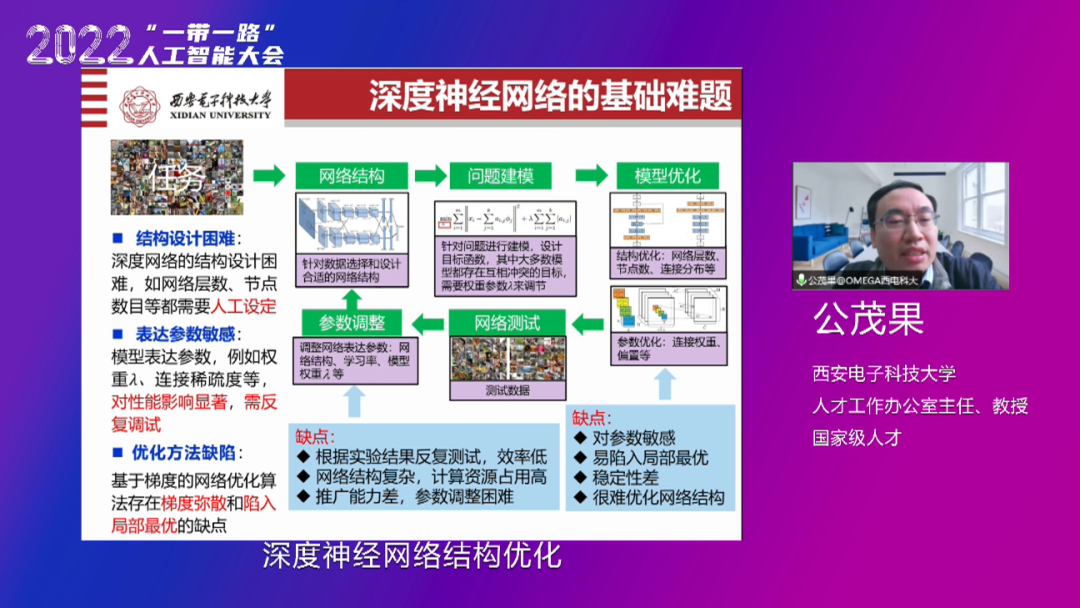 国家级人才、开元集团网站公茂果教授的报告介绍了团队近期在解决深度神经网络结构优化难题上的一些思路和尝试,以及在深度神经网络应用上的一些新进展。公茂果教授的报告从四个方面展开,第一,深度神经网络的优势和困难。深度神经网络的优势包括:深层结构,复杂建模,特征学习,自主分析,推广性强,应用广泛。深度神经网络的困难包括:结构设计困难、表达参数敏感和优化方法缺陷。第二,深度神经网络结构优化初探。具体分为以下五个方面:1.避免表达参数。2.超越梯度优化。团队提出的自然梯度优化结合了华为昇腾AI计算芯片中使用的达芬奇架构,可以批量化的计算小矩阵的逆,能够进一步提升计算效率。3.神经网络压缩。团队提出了网络流数据分类的神经网络压缩方法,将生成对抗训练和知识蒸馏相结合,并对网络重要性因子进行稀疏约束,达到网络裁剪目的,得到压缩率与准确率的平衡。4.隐私保护学习。针对数据分散且无法集中收集或共享的问题,团队提出了多方对偶学习,通过对偶预测补全缺失数据,保持原有数据结构不变,重叠验证扩充训练数据。此框架同时保护了数据隐私性和计算安全性。5.训练样本学习。团队提出了SPL模型和MOSPL模型,通过协同训练产生预测概率对节点进行排序,采用自步学习逐步将节点加入到训练集中,一方面将高置信度的伪标签扩充至训练集,另一方面减轻难以分类的节点对模型训练产生的扰动。第三,遥感影像变化检测应用探索。公茂果教授从遥感影像变化检测、多类变化检测、超像素变化检测、多视角变化检测、特定目标变化检测以及高光谱影像变化检测等多个方面进行了应用探索。最后,公茂果教授对深度神经网络结构优化的未来发展方向进行了展望。