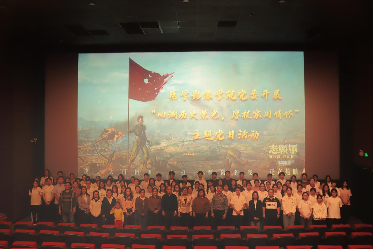 为纪念中国人民志愿军抗美援朝出国作战75周年,深化爱国主义教育,10月22日晚,医学影像学院党委全体党员及入党积极分子在恒基广场银座影城开展“回溯历史荣光,厚植家国情怀”主题党日活动,通过集体观看红色史诗影片《志愿军:浴血和平》,重温抗美援朝历史,引导广大党员从红色历史中汲取奋进力量。