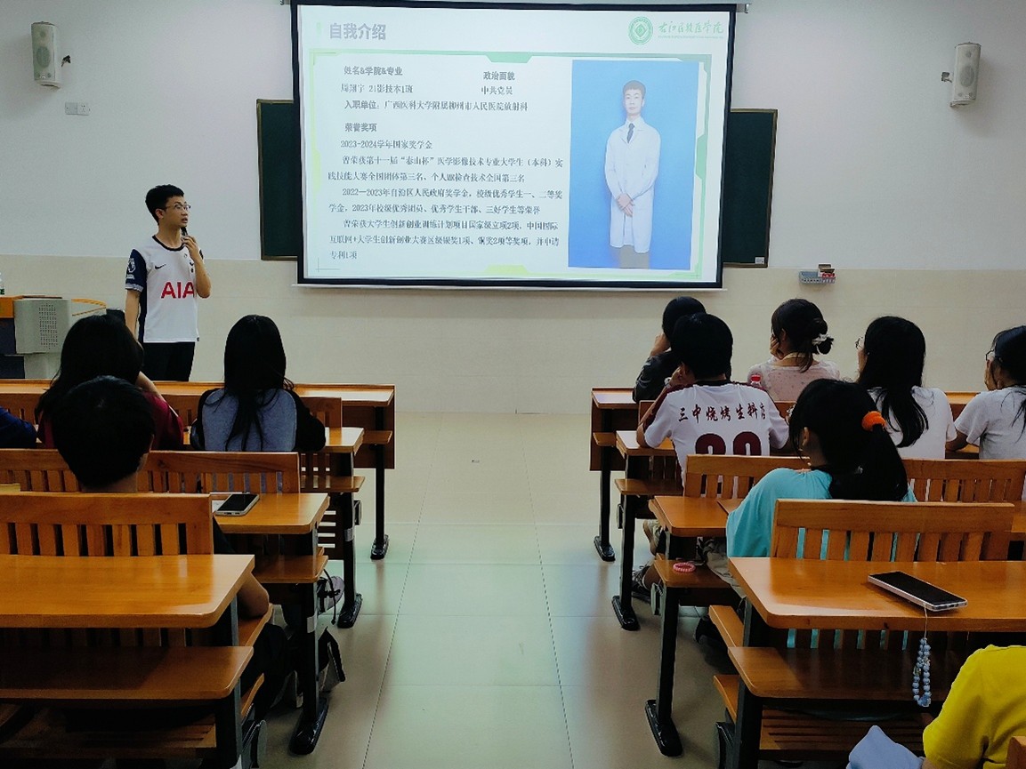 活动由医学影像学院党委副书记黄春苗和学生科科长卢小新在两个教室主持。黄春苗向同学们着重介绍了华黎城、谢荣锦、雷新宇、周翔宇等四位优秀毕业生的基本情况,卢小新阐述了本次活动的意义,指出近期同学们在学习中暴露出的问题与不足,强调此次交流会旨在搭建经验交流平台,助力同学们汲取宝贵经验,为未来职业生涯筑牢根基,期望能借此激发同学们的思考并促使其付诸行动。